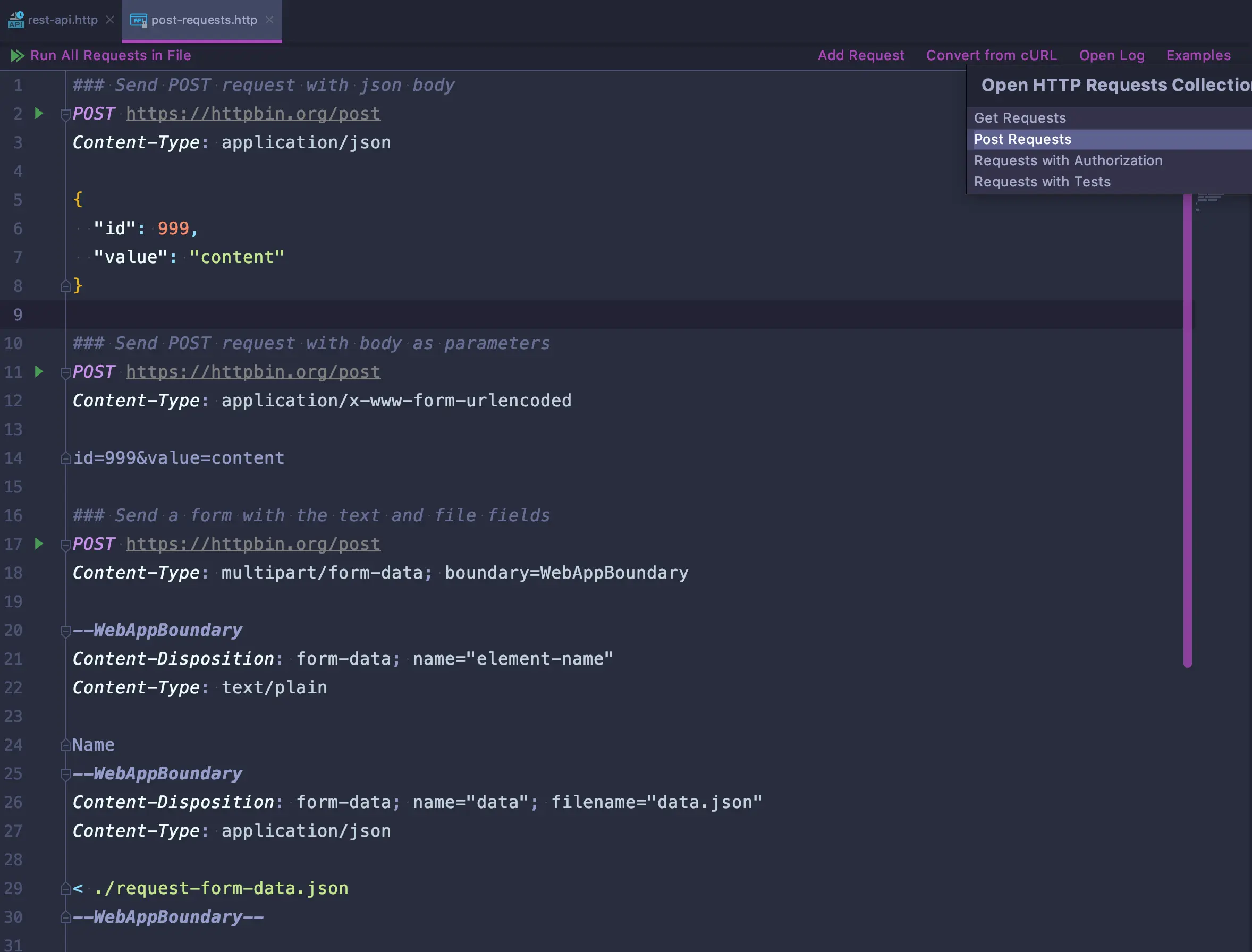 都知道,通常写一个完整的请求需要写好多内容,贴心的 IDEA 给我们提供了模版,我们只需要在 Examples 中找模版就可以啦,比如找 POST 请求的模版,选取合适的拷贝过去就可以,so easy~~~