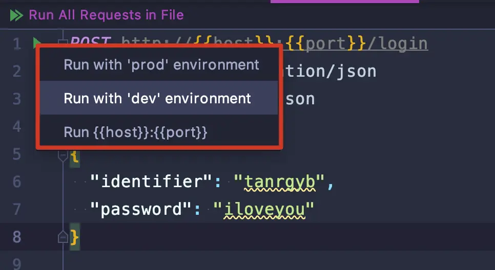 环境变量需要定义在环境文件(与request文件放在同一目录下即可)中,环境文件有两种:
