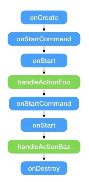 在外部调用startActionFoo()或startActionBaz()后,将启动MyIntentService然后会调用到onHandleIntent(…),onHandleIntent根据调用的时序,来决定优先处理哪个方法。在此实例中是先执行startActionFoo()然后再执行startActionBaz()。
