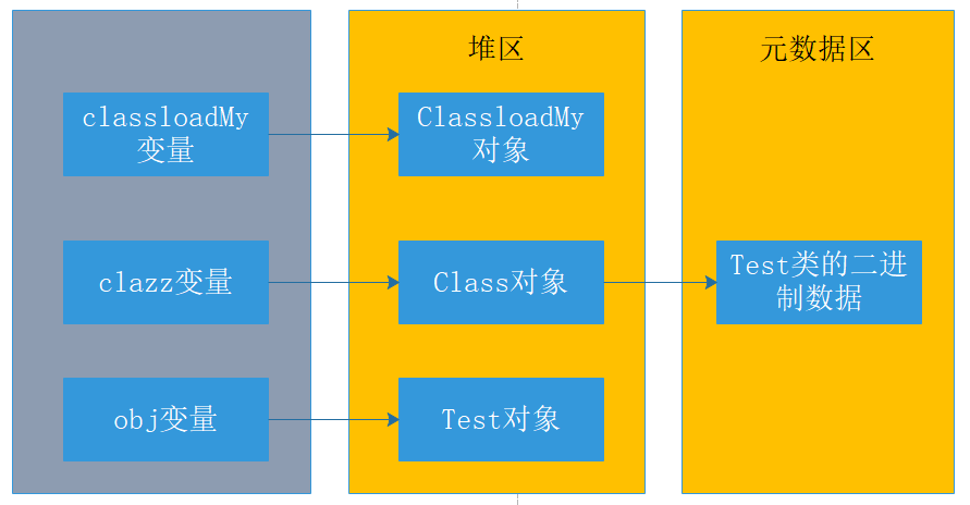 我画了一张图,方便大家更好的理解,如下,当左边的三个变量都指向为null时,最右边的元数据区域的代表Class对象的Test二进制数据就会被卸载,当下次使用时就会被重新加载,初始化等。