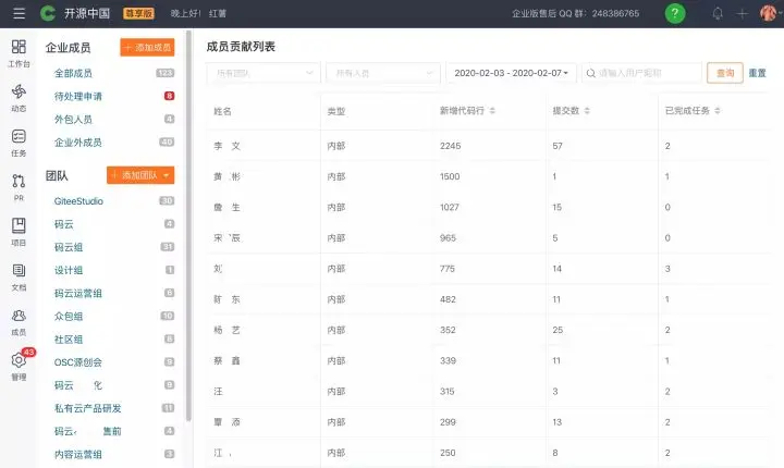 如果你上面使用了“任务”来管理开发人员承担的”需求“,并且在提交代码时关联了对应的”任务“,那我们就很容易在工具中看到每个开发人员完成的任务数和提交代码量了。