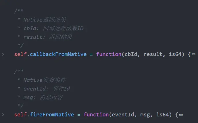 针对异步调用的结果返回以及native事件通知,LXJSBridge.js在接口层面也是设计了两类native调用js接口:异步调用返回结果使用callbackFromNative方法;事件触发使用fireFromNative方法。