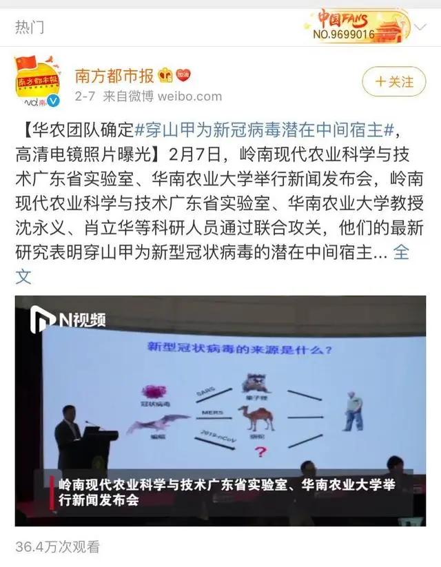 这几天,对于宿主的预测研究有了新的发现,在7日上午,华南农业大学、岭南现代农业科学与技术广东省实验室教授沈永义、肖立华等科研人员,通过联合攻关,他们的最新研究表明,穿山甲为新型冠状病毒的潜在中间宿主。