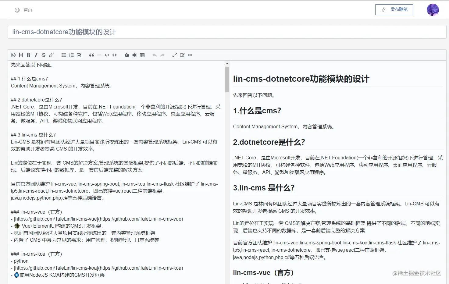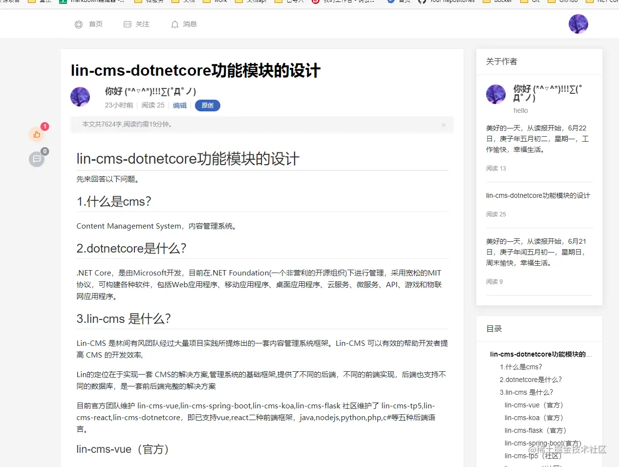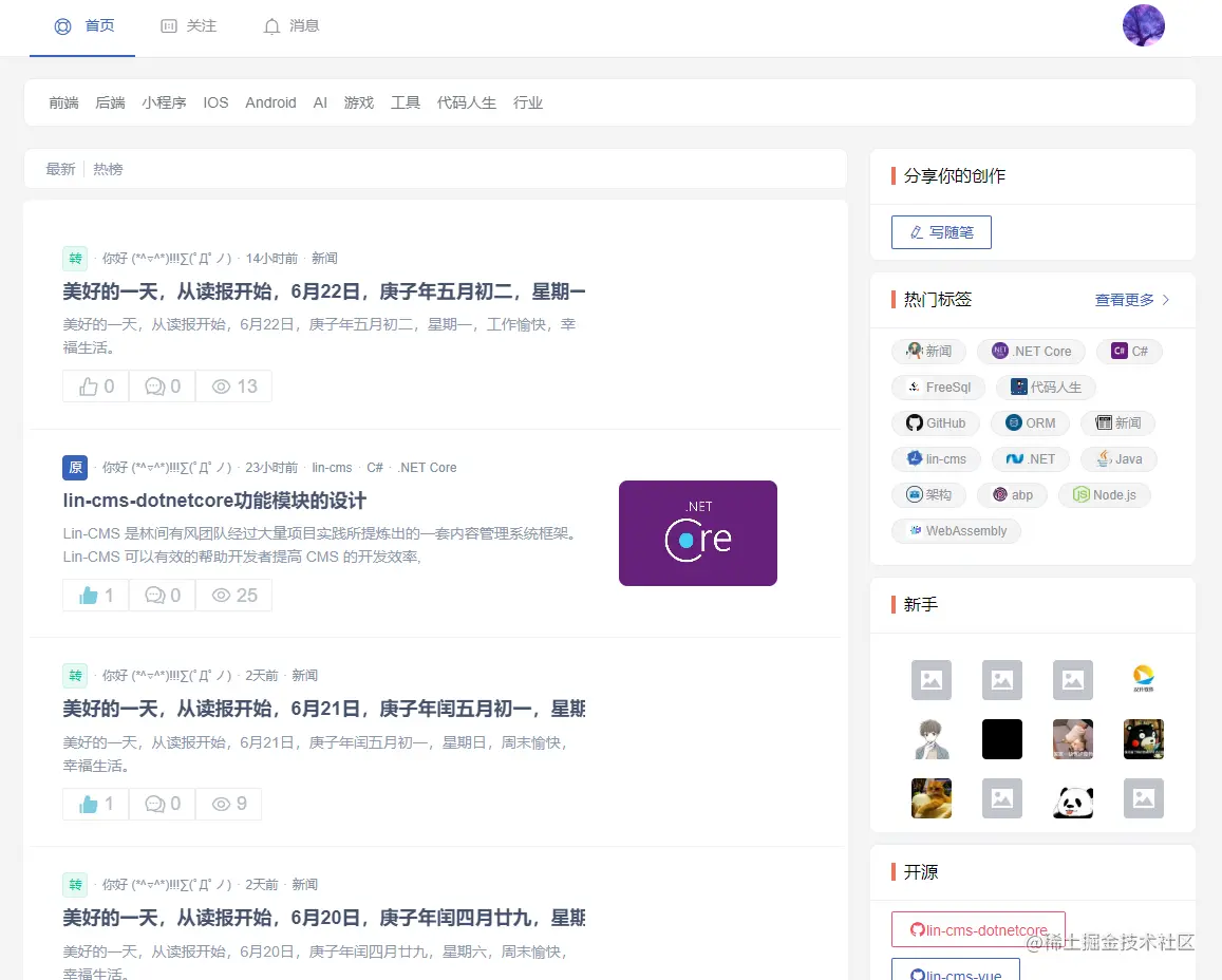 基于.NET Core3.1实现的LIN-CMS-VUE后端API,并增加了博客模块。目前实现简约的权限管理系统、基础字典项管理、随笔专栏,评论点赞、关注用户、技术频道(标签分类)、消息通知,标签等仿掘金模块。