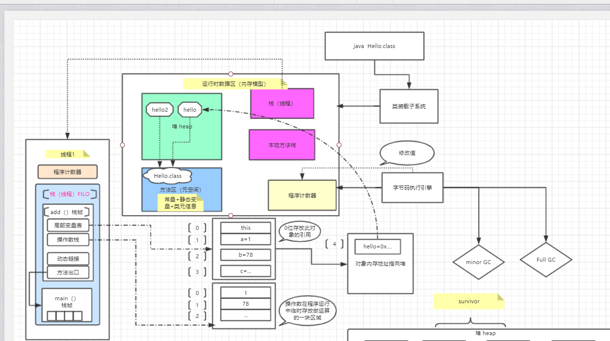 首先:假设有一个Hello.java类,通过javac 编译为Hello.class字节码文件,通过类装载子系统,加载进JVM虚拟机中