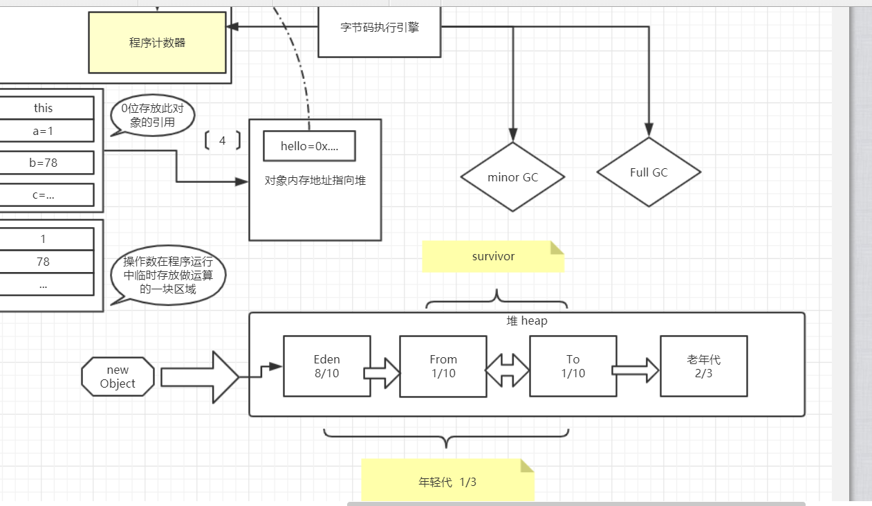 堆是内存分配中最大的一块区域,也是GC重点关注的区域,GC回收前要判断堆中哪些对象存活,哪些不可能再被引用,需要回收。GC分为两种 minor GC 和 Full GC。
