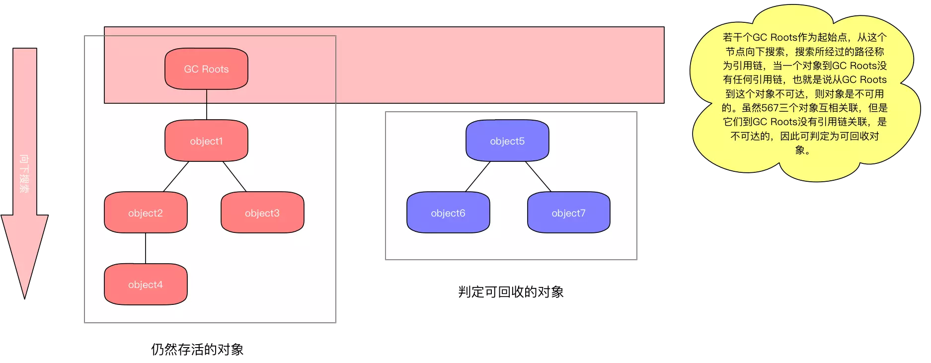 可达性分析:以若干个GC Root为根节点,从节点向下搜索,如果一个对象没有被若干条引用链所引用到,则证明这个对象不可达。