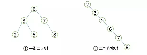 由于二叉查找树可以任意构造,同样的值,可以构造出如图②的二叉查找树,显然这棵二叉树的查询效率和顺序查找差不多。若想二叉查找数的查询性能最高,需要这棵二叉查找树是平衡的,也即平衡二叉树(AVL树)。