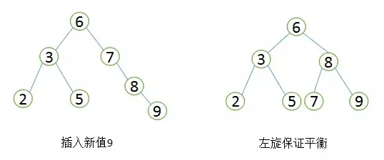 平衡二叉树首先需要符合二叉查找树的定义,其次必须满足任何节点的两个子树的高度差不能大于1。显然图②不满足平衡二叉树的定义,而图①是一课平衡二叉树。平衡二叉树的查找性能是比较高的(性能最好的是最优二叉树),查询性能越好,维护的成本就越大。比如图①的平衡二叉树,当用户需要插入一个新的值9的节点时,就需要做出如下变动。