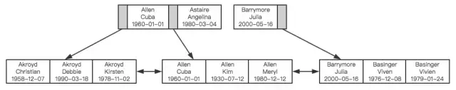 一种行之有效的解决方法是减少树的深度,将二叉树变为m叉树(多路搜索树),而B+Tree就是一种多路搜索树。理解B+Tree时,只需要理解其最重要的两个特征即可:第一,所有的关键字(可以理解为数据)都存储在叶子节点(Leaf Page),非叶子节点(Index Page)并不存储真正的数据,所有记录节点都是按键值大小顺序存放在同一层叶子节点上。其次,所有的叶子节点由指针连接。如下图为高度为2的简化了的B+Tree。
