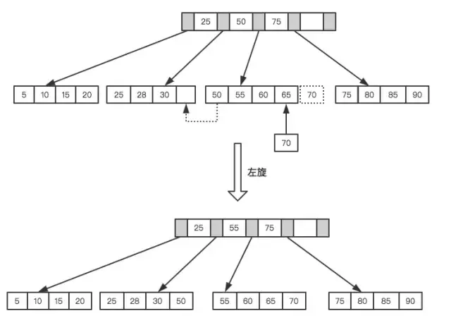 通过一次左旋操作就将插入后的树重新变为平衡二叉树是最简单的情况了,实际应用场景中可能需要旋转多次。至此我们可以考虑一个问题,平衡二叉树的查找效率还不错,实现也非常简单,相应的维护成本还能接受,为什么MySQL索引不直接使用平衡二叉树?