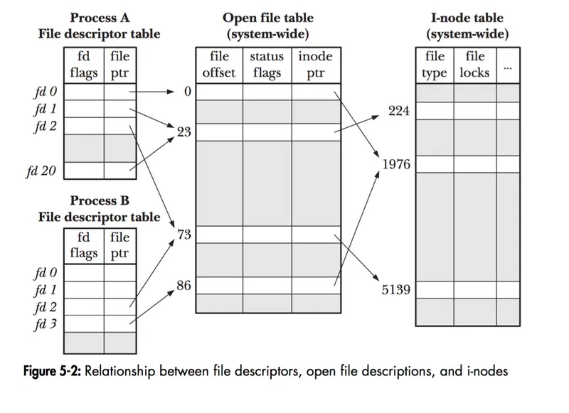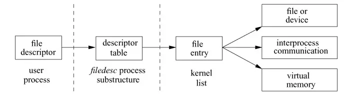 每个描述符都指向内核中的File entry的数据结构。file entry为每个描述符维度了一个file offset。系统调用命令open创建file entry.