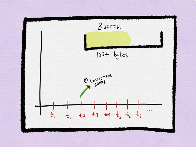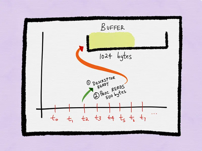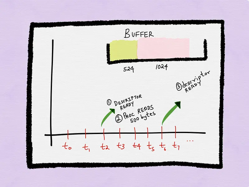 假设到了t3时刻,进程拉取描述符的状态并且描述符就绪。进程可以执行整个I/O操作(例如读取socket上所有可用数据)