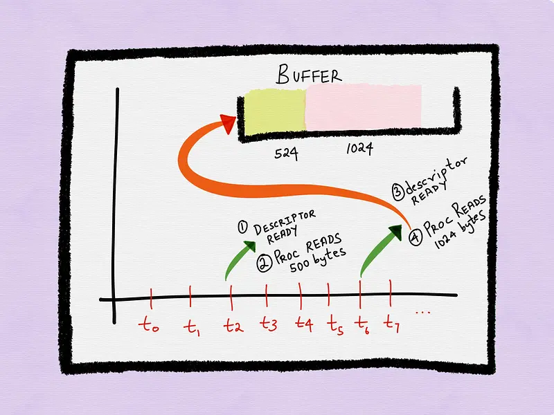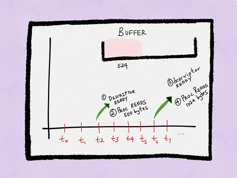 假设进程在t6时刻接到下次通知,buffer中又有1024个字节可用。此时buffer中可用的数据为1548个字节——524字节是上次没读的,1024是新到达的。