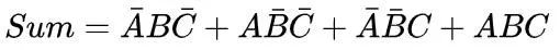 “你们看,把 A and B 记作 AB,A or B 记作 A + B,not A 记作 A 上面画个横线。 Sum 输出为1只出现在表格的2、3、5、8行,也就是三个输入中1的个数为奇数的时候 。我们把这4种情况记下来,那么这个式子...”