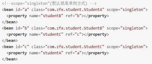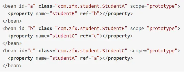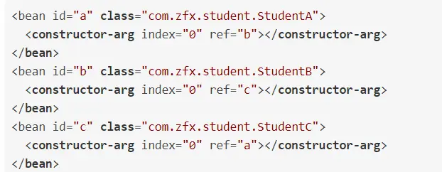 OK,上面是很基本的3个类,StudentA有参构造是StudentB。StudentB的有参构造是StudentC,StudentC的有参构造是StudentA ,这样就产生了一个循环依赖的情况。