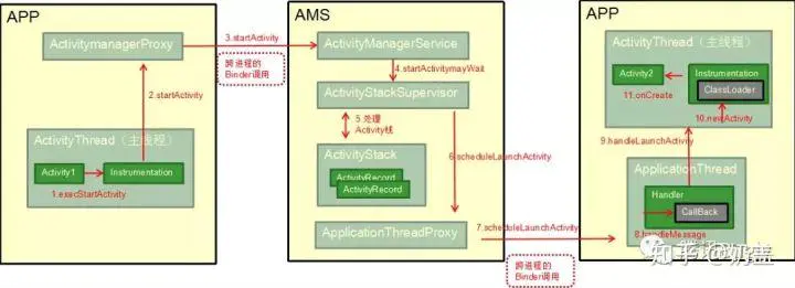ActivityManagerService(AMS)中,其内部会处理Activity栈。之后又通过跨进程调用进入到Activity2所在的进程中。 ApplicationThread是一个binder对象,其运行在binder线程池中,内部包含一个H类,该类继承于Handler。ApplicationThread将启动Activity2的信息通过H对象发送给主线程。- 主线程拿到Activity2的信息后,调用Instrumentation类的