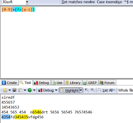 以(?=exp)示例(其它差不多):只有数字后面有字母才被匹配。