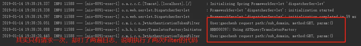 项目中使用的是Spring-security作为权限框架,然后做了一个JwtAuthenticationTokenFilter作为拦截器拦截请求,校验Token,但是每次请求都会打两遍日志。下面是精简的源代码: