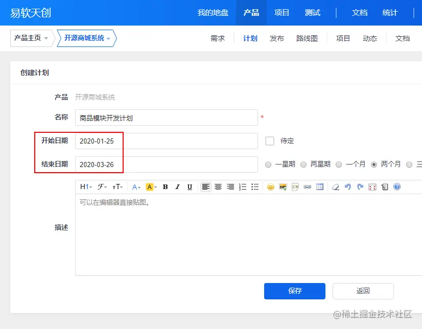 - 创建时需要完善项目信息,设定项目开发时间以及关联相关产品与计划: