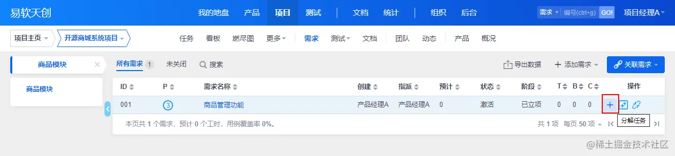 - 创建完需求后还需要对需求进行评审操作,只有评审通过的需求才会由项目经理进行任务分解,从而转为为开发任务指派给开发团队: