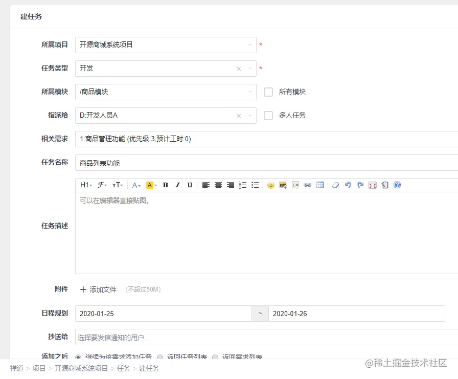 - 这里把商品管理功能这个需求分解为了商品列表、添加商品和编辑商品三个任务并指派给了开发人员。