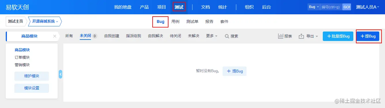 测试团队是项目质量的保证,测试团队主要负责对项目的版本进行测试,提出Bug指派给开发人员,开发人员解决Bug后对Bug进行验证并关闭。下面我们用测试人员的账号登录,来演示下测试人员在敏捷开发中所要做的事情。