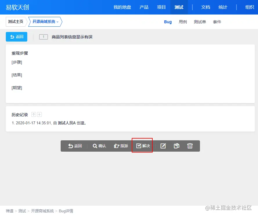 - 当开发人员解决完Bug后可以把Bug标记为已经解决: