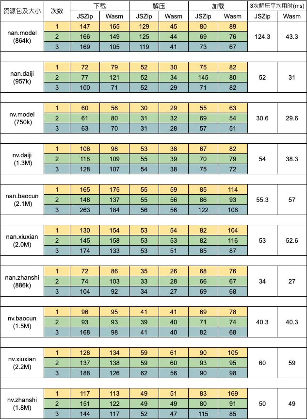 测试方法是通过页面加载3次资源并渲染,资源共有10个压缩包,大小从几百k到2M+不等,整个流程包括下载、解压、加载三个部分,重点关注解压部分,对比JSZip和Wasm两个版本的处理耗时数据如下(测试使用Chrome浏览器):