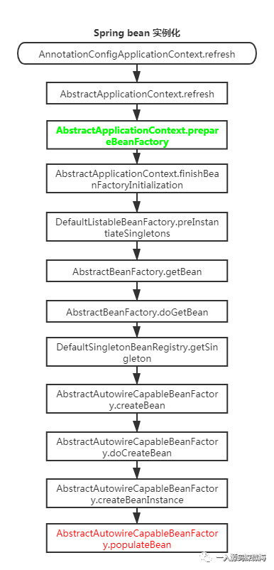 那你一定很好奇,这个类是什么时候被调用的对吧。其实还要看前面 Spring 实例化流程图,流程图的最后一步是 populateBean 方法,但是却不是终点,其实接下来还有一个方法就是 initializeBean 方法。