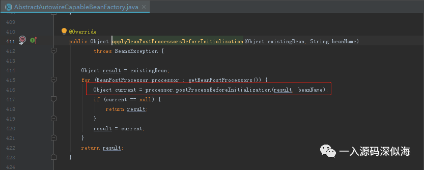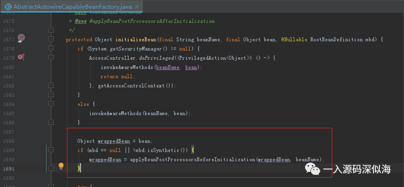 我们来看看 initializeBean 方法,重点关注红框部分。