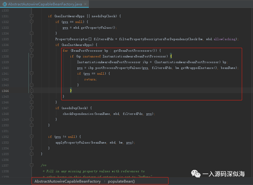 由于此方法过长,而我们只用关注我图中画红框部分即可,此处会执行 Spring 自定义的属性设置后置处理器。如果你还记得前面我打印的所有的 beanNames 的话,里面有一个 AutowiredAnnotationPostProcessor,此方法就会执行这个后置处理器,并设置 Bean 实例的属性值。
