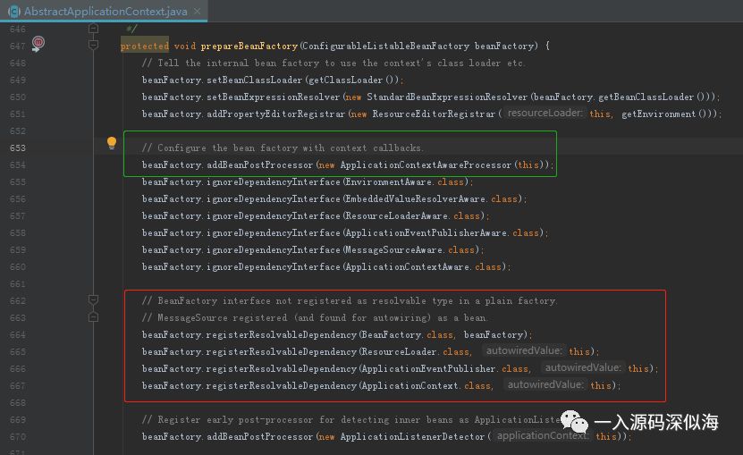 到此第一种方法获取 ApplicationContext 实例的源码我们就讲完了,下面再来看看第二种吧。还请看下还是上面 prepareBeanFactory 方法的那幅图,奥秘也在里面哦,请注意绿色框部分。