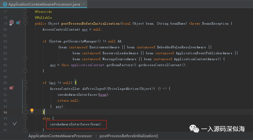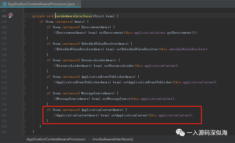 可以看到方法最后一步就是判断,如果当前 bean 的实例是属于 ApplicationContextAware,那么就调用 bean.setApplicationContext 方法,而参数正是 ApplicationContext,这个时候就会回调我们实现了 ApplicationContextAware 接口重写的方法,然后把参数传递给我们的类。