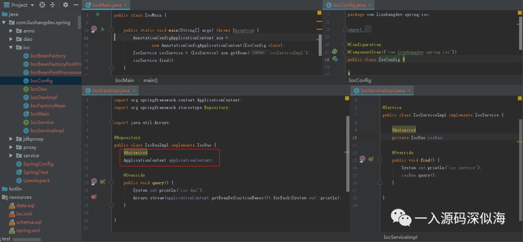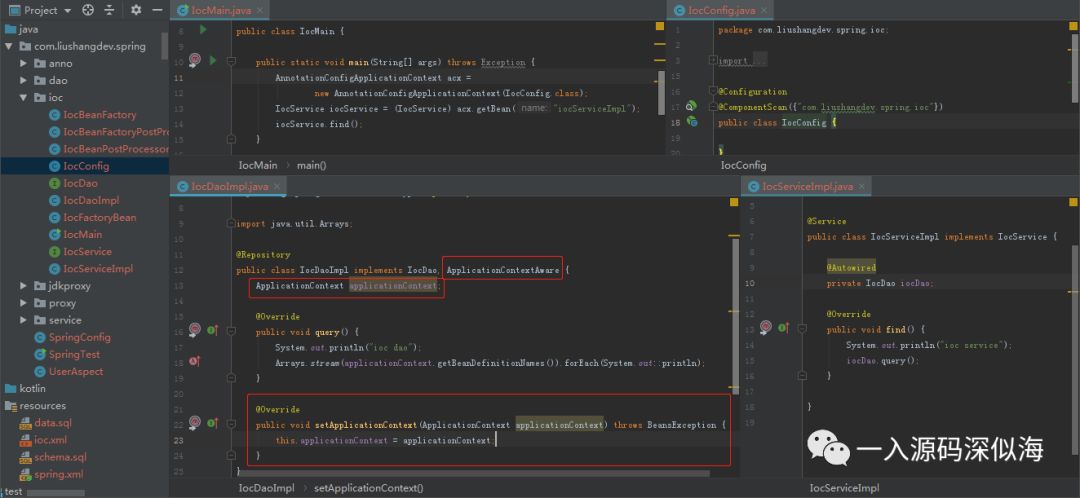 那么重点来了,你可以看到我打印了 ApplicationContext 中所有的 beanNames,然而里面却没有 ApplicationContext 这个 Bean,那 Spring 是怎么帮我们拿到它的实例的呢。有没有一点好奇呢?接下来我来带你进入源码看一看吧。 首先我们先来看一看第一种方法的时候,Spring 是怎么帮我们处理的吧。其实如果你看过我前面的文章应该就能知道了。