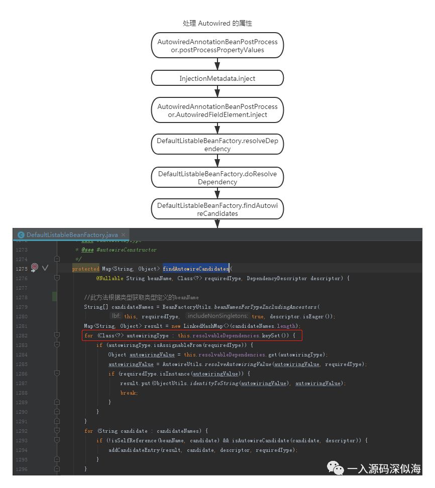 上图就是后置处理器用来处理标注了 @Autowired 注解的处理流程,其中BeanFactoryUtils.beanNamesForTypeIncludingAncestors 方法会根据我们定义的属性的类型去 Spring 中缓存的 Bean 集合查找类型与之匹配的 Bean,并返回其 beanName,而我们的 ApplicationContext 是不在缓存当中的,这个可以从文章开始处,我打印的 beanNames 集合看到。