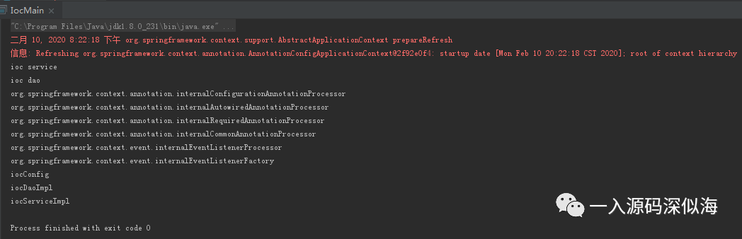 可以看到程序调用结果,我们顺利的拿到了 ApplicationContext,并打印了项目中所有的 beanNames。