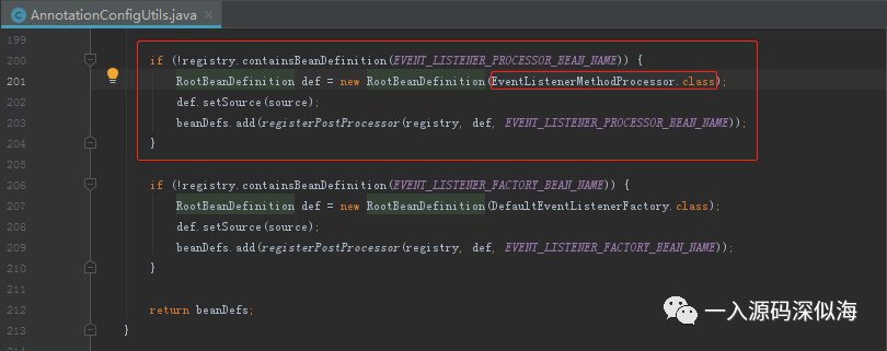 由于此方法过长,我们重点关注红框部分,首先是判断是否包含一个 bean,如果不包含则注册 EventListenerMethodProcessor 后置处理器。我们来看看这个常量的定义。