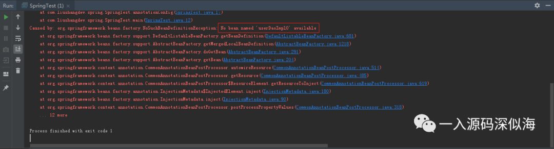 注意 UserServiceImpl 中声明的属性 userDao,在 spring.xml 配置文件中没有这个属性对应的 Bean,@Resource 没有配置 name 和 type 的情况下,结果是什么呢?现在大家猜一下执行成功还是失败。