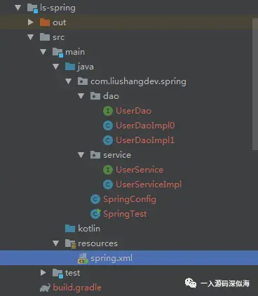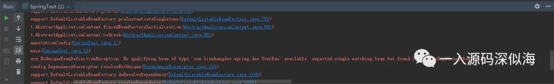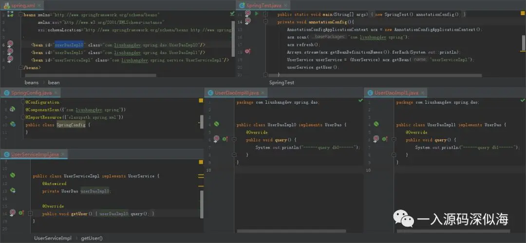 spring.xml 配置文件中配置了两个 UserDao 接口的实现类 UserDaoImpl0 和 UserDaoImpl1,打印了简单的一句话。结果肯定显而易见,报错了。