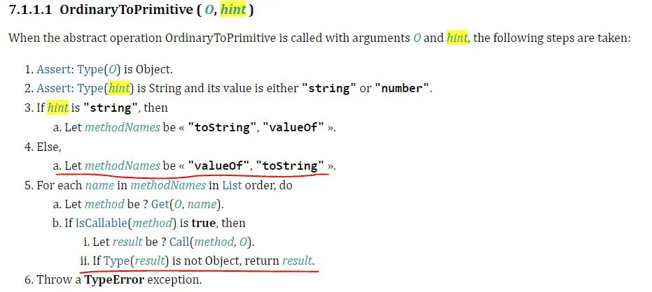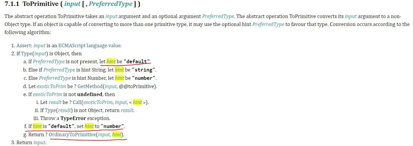 ToPrimitive(x)就是一个重点中的难点了。参见ES规范7.1,ToPrimitive( input [ , PreferredType ])是包含两个参数的抽象的操作,一个是 input argument 参数,一个是可选参数 PreferredType,该操作就是将 input argument 转换为 no-Object type (非 object 类型的值,即js数据类型的5种普通类型)。