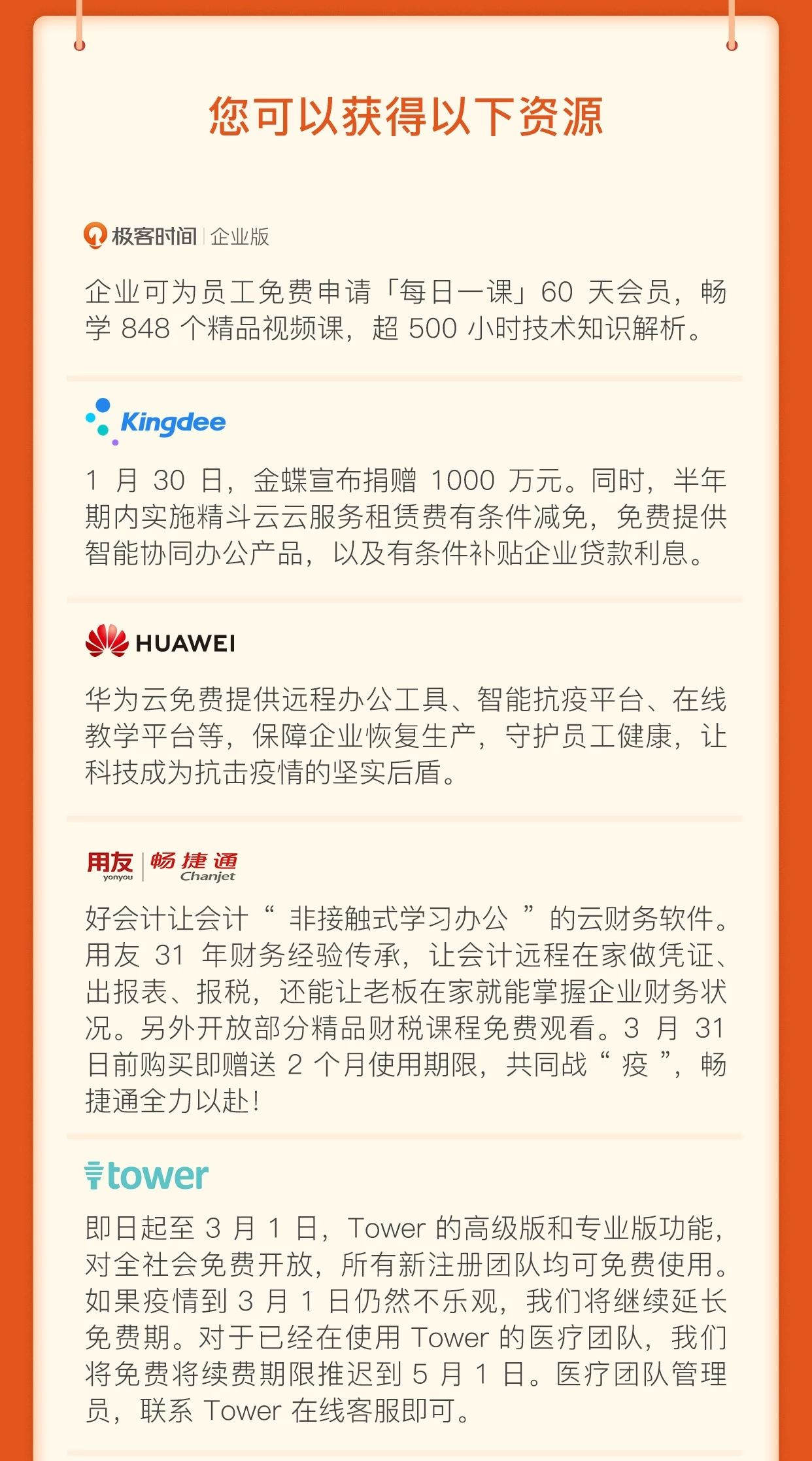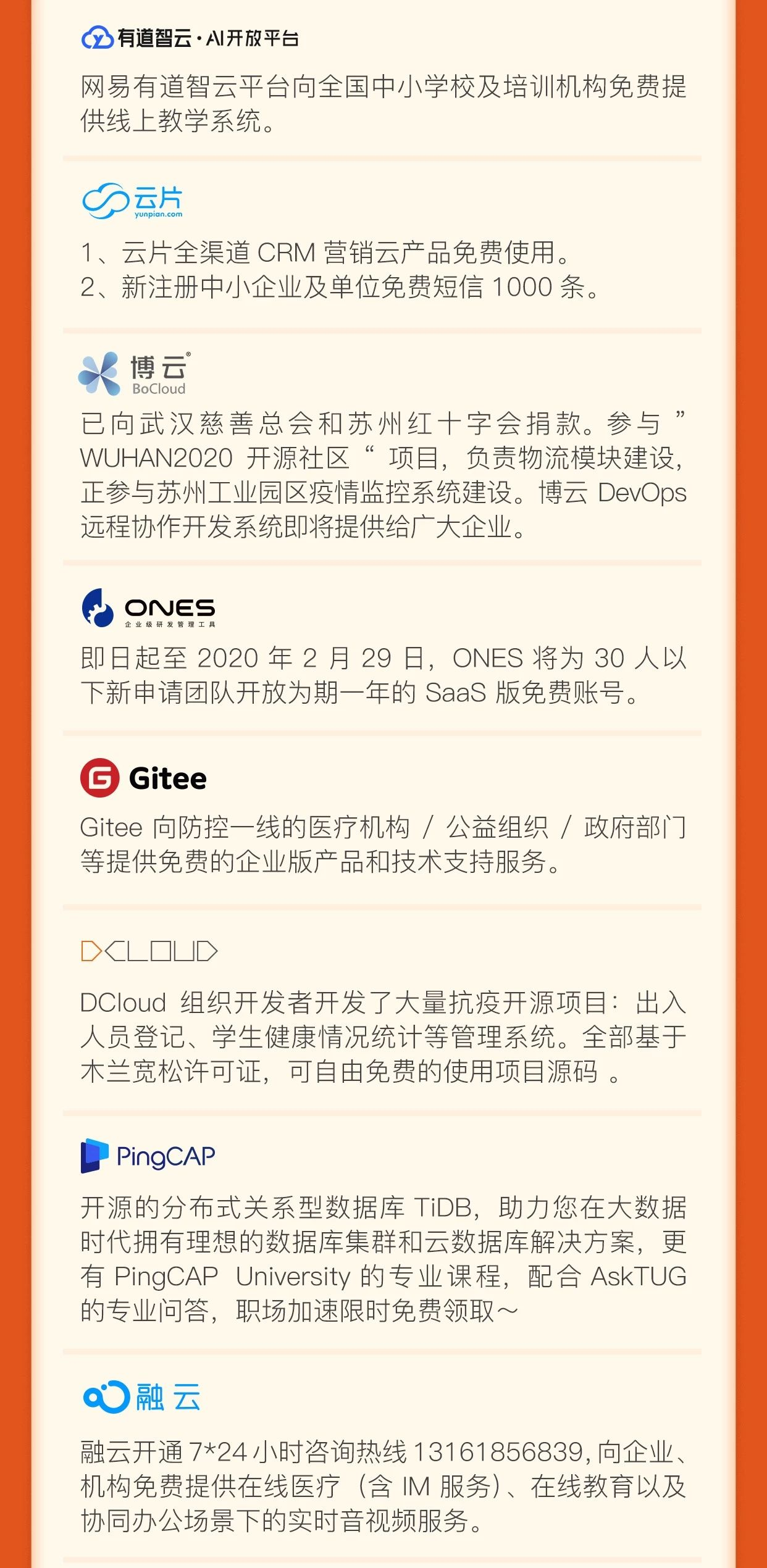 方云与极客邦科技为此特别联合百家企业共同发起“抗击疫情企业联合行动”,向社会各界有ToB 业务扶持、远程办公、在线医疗、在线教育等需求的企业和个人,提供工具类、平台类、产品类、资源类、知识服务类公益支持。让我们众志成城,共渡难关。
