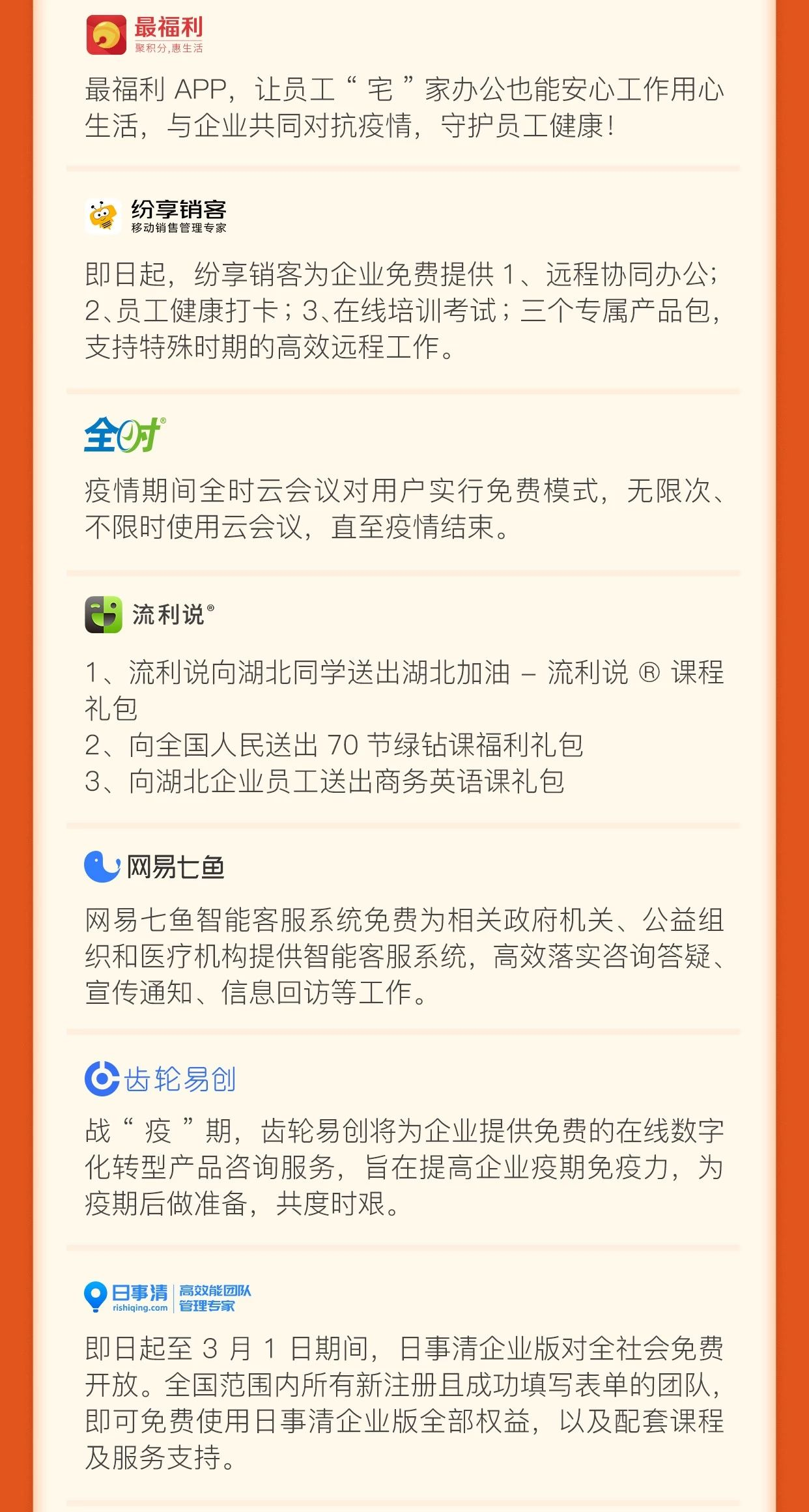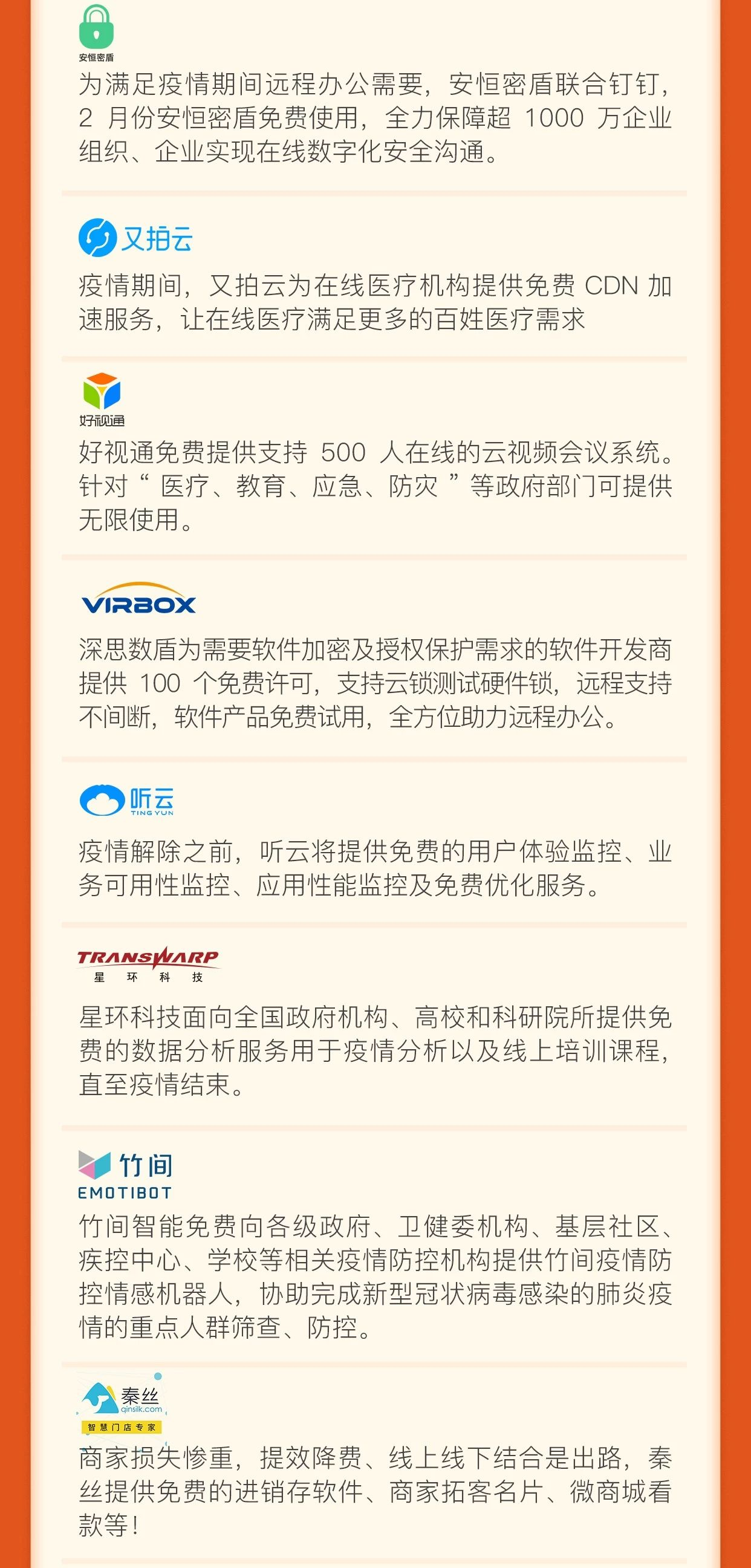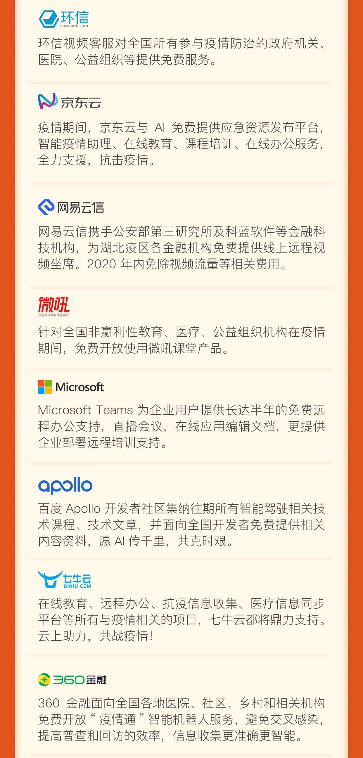 远程办公类:服务于有远程办公需求的企业和政府机构,包括免费的协同办公产品、在线办公服务、远程视频服务、直播会议服务、云计算资源等;