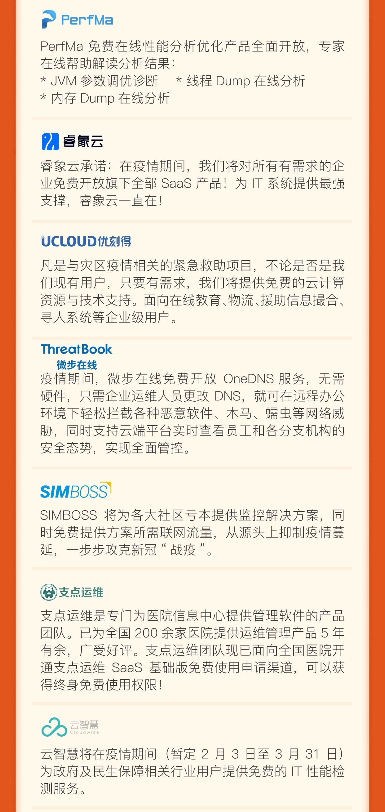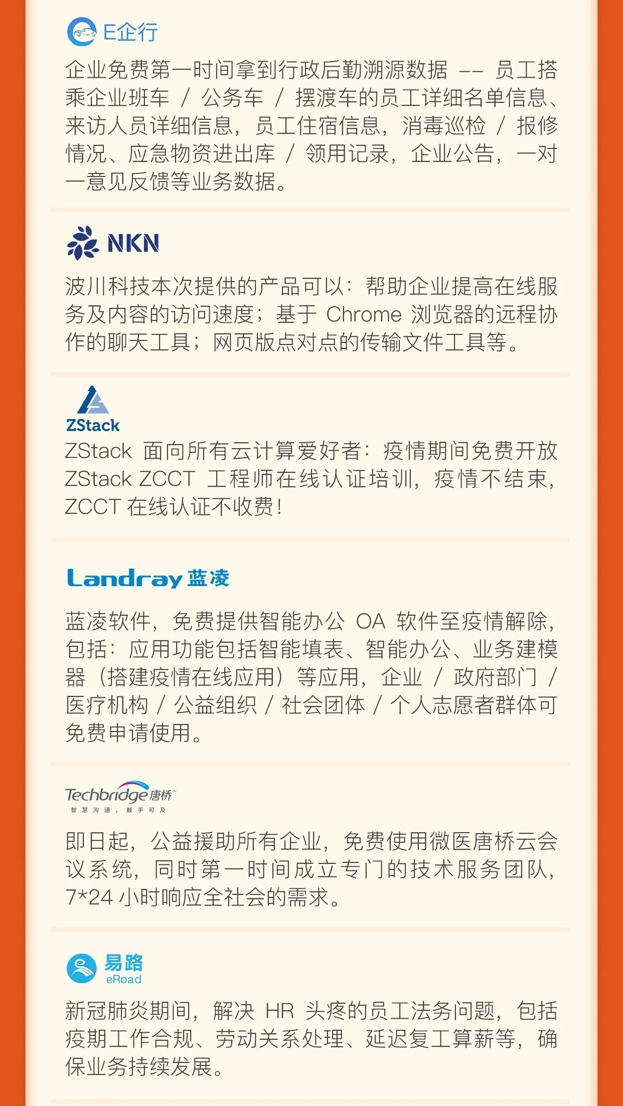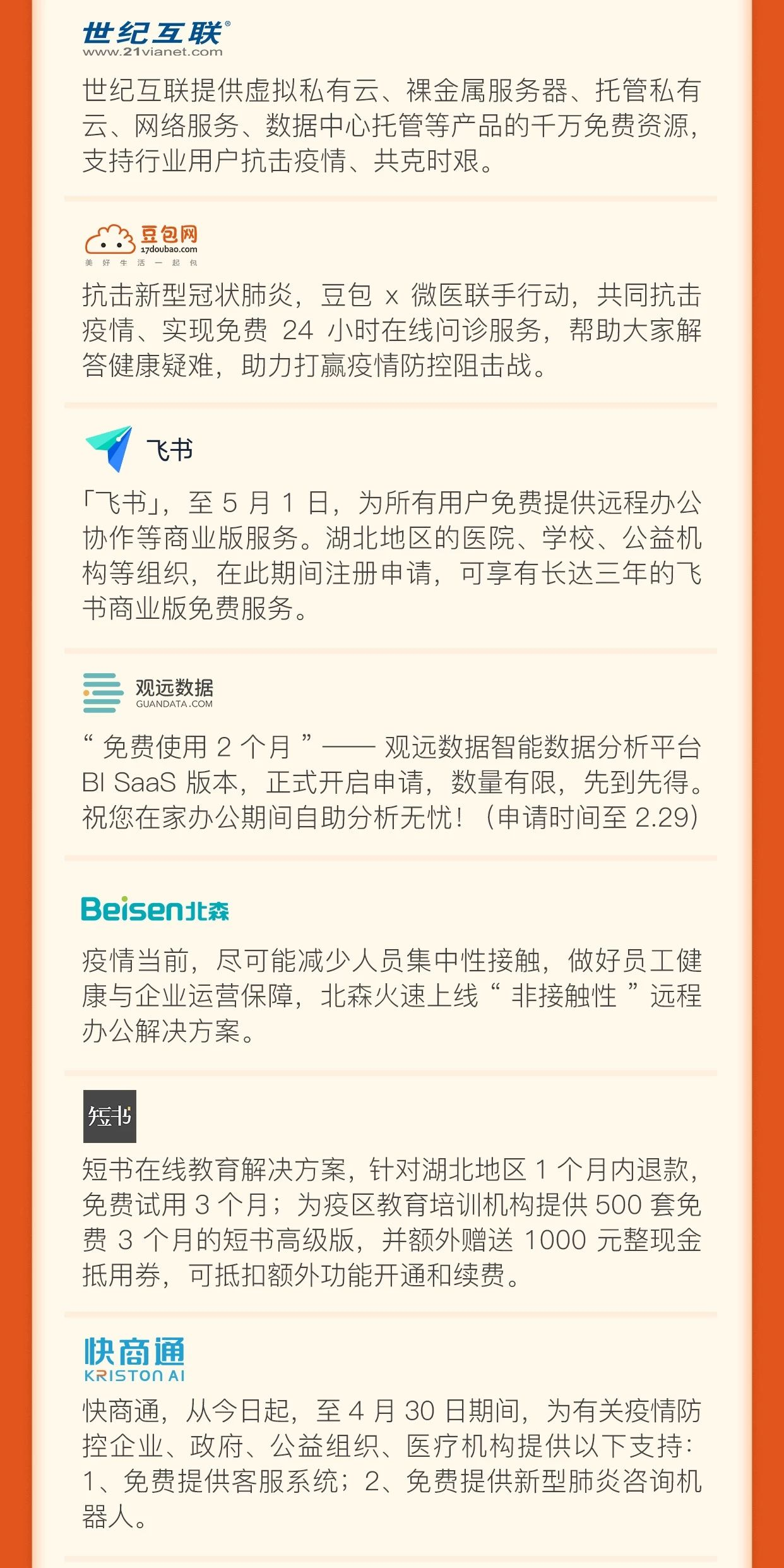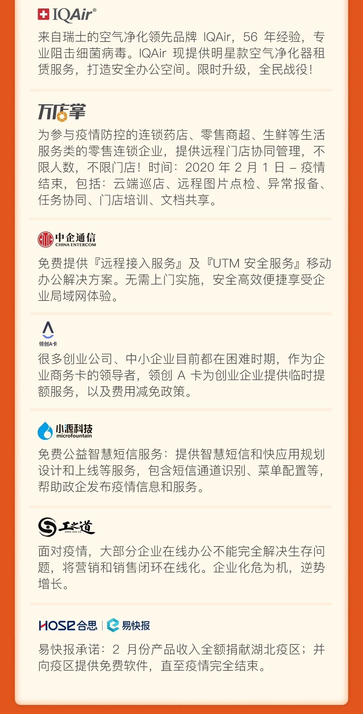 远程办公类:服务于有远程办公需求的企业和政府机构,包括免费的协同办公产品、在线办公服务、远程视频服务、直播会议服务、云计算资源等;