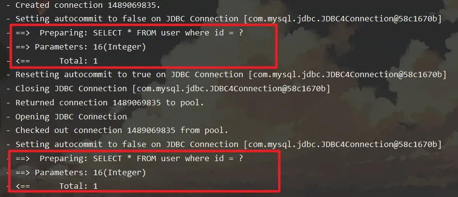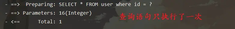 可以很明显的看到,当我们在同一个 sqlSession的情况下,当我们第一次查询 id 值为 16 的用户时,从数据库中确实查询到了数据,而第二次查询的时候,却没有任何日志的数据,而同时我们可以看到,通过输出语句,看到两个对象是完全相同的,这也就意味着,第二次查询不是从数据库查询出来的,而是从缓存中