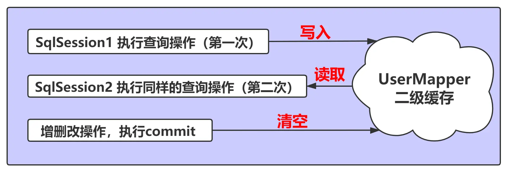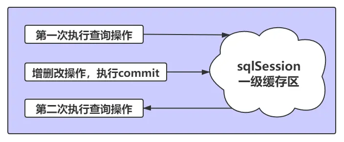 - 但是,如果在下一次操作中,执行了 commit 操作,也就是执行了增删改的操作,一级缓存区域内的内容会被清空,这是为了保证缓存中的数据的有效性,避免脏读的产生
