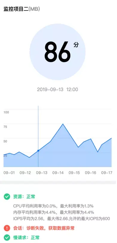 首先,可以为数据库的健康状况打分。将数据库的核心监控指标(例如活跃连接数、CPU、内存、磁盘等)纳入到评分模型中,同时也将结合数据库的历史异常率,慢日志、死锁、审计日志等深层次分析找出潜在问题。