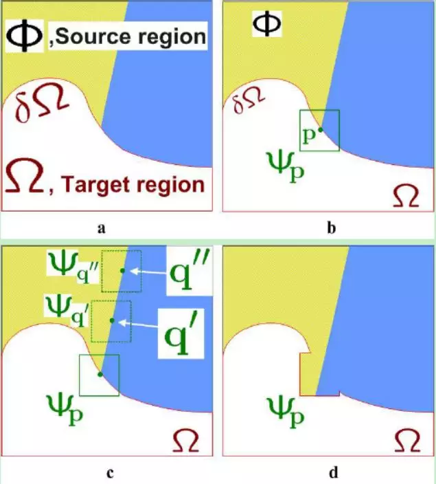 该类方法每次填充待补绘区域的一个patch,其核心思想就是利用图像本身的冗余性(redundancy),用图像已知部分的信息来补全未知部分。