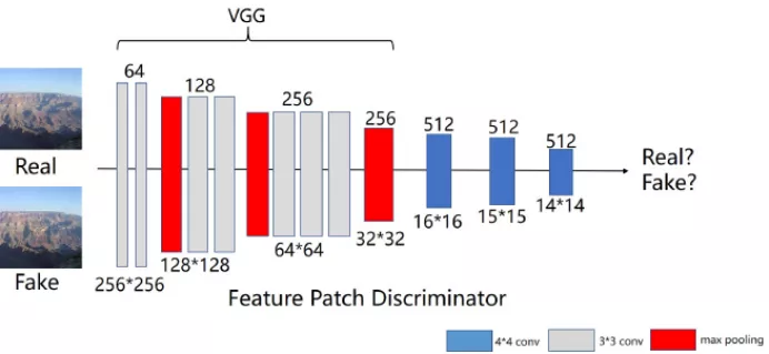 使用VGG提取图片的特征空间,并在这个特征空间上利用patch discriminator进行对抗损失计算,这样能够更加好的帮助生成器理解图像信息,同时稳定辨别器训练。