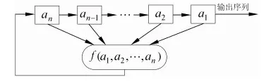 初始状态由用户确定,当第 i 个移位时钟脉冲到来时,每一级存储器 ai 都将其内容向下一级 ai - 1 传递, 并根据寄存器此时的状态 a1 , a2 , …, an 计算 f ( a1 , a2 , …, an ) ,作为下一时刻的 an。